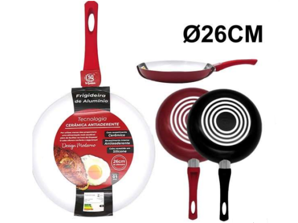 Frigideira em alumínio, com superficie antiaderente e revestimento em cerâmica.